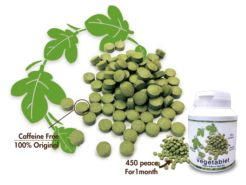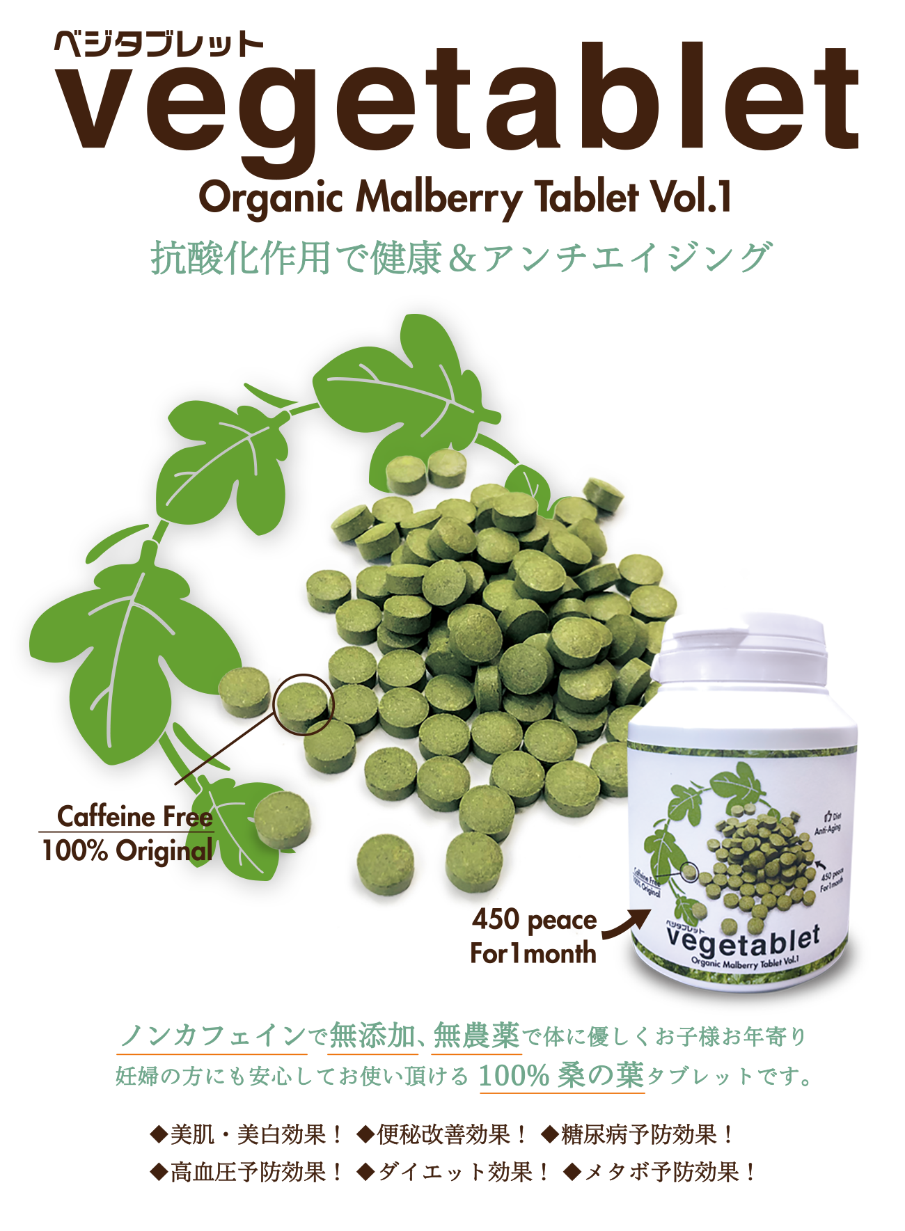 ベジタブレットは、ノンカフェインで無添加、無農薬で体に優しくお子様お年寄り妊婦の方にも安心してお使い頂ける100%桑の葉タブレットです。