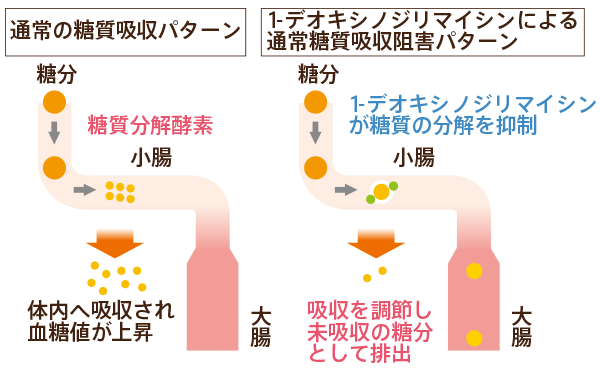 この桑の葉に含まれる「1-デオキシノジリマイシン」はα-GI物質の一種 です。通常、唾液や膵臓でグルコースに分解された糖を小腸でグルコシダ ーゼが吸収します。それがこの1-デオキシノジリマイシンのα-GI効果で グルコシダーゼの働きを抑えてくれることで、糖の吸収を遅らせることが 出来ることが分かりました。糖の吸収を遅らせ、血糖値の上昇を抑制し、 インスリンの分泌を抑えてくれます。
